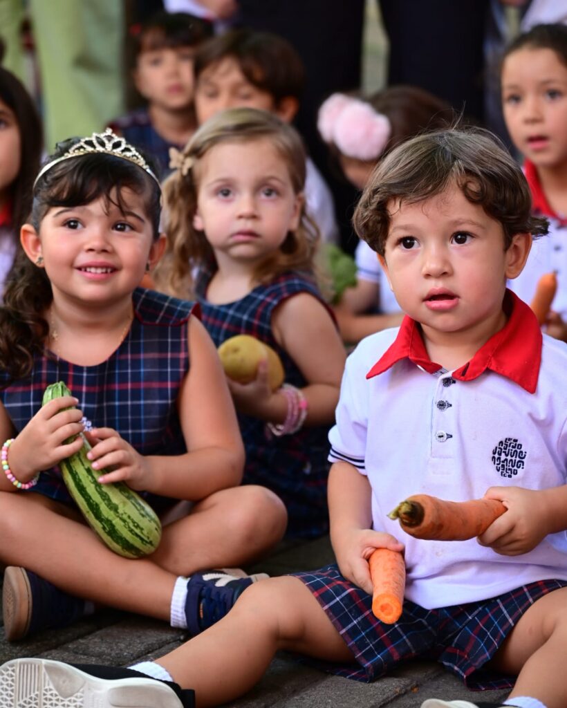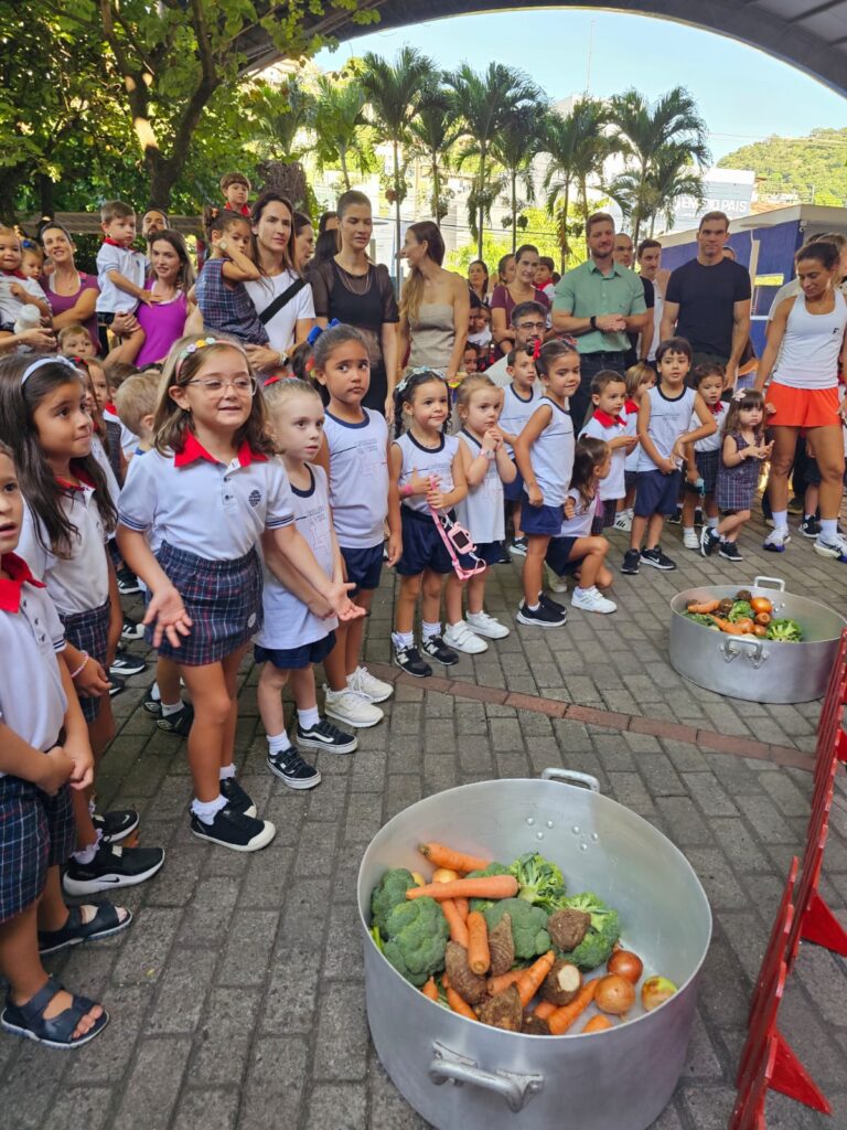 Cada criança trouxe um legume ou verdura, contribuindo para essa vivência do nosso Projeto Alimentar, que une aprendizado, música e alimentação saudável.